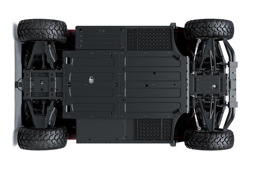 Es wird sowohl vorne als auch hinten eine Doppelquerlenkeraufhängung eingesetzt, um sicherzustellen, dass jedes der Räder Hindernisse mit minimaler Beeinträchtigung des Fahrwerks überwinden kann.